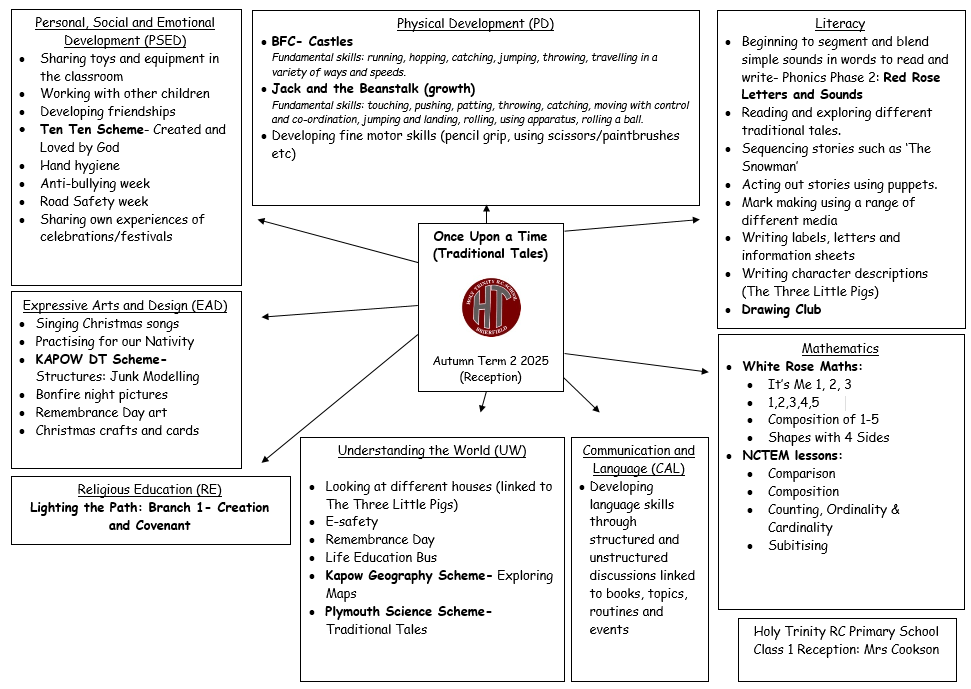 Our Reception topic this half-term is 'Once Upon a Time'. Reception will be focused on traditional tales whilst Pre-School will be looking at nursery rhymes. We will be exploring the 'big idea' that stories have characters, settings and events, stories rhyme and have patterns and we can also retell stories in our own way. We will also be practising our Nativity play and celebrating seasonal events such as Bonfire Night and Christmas.